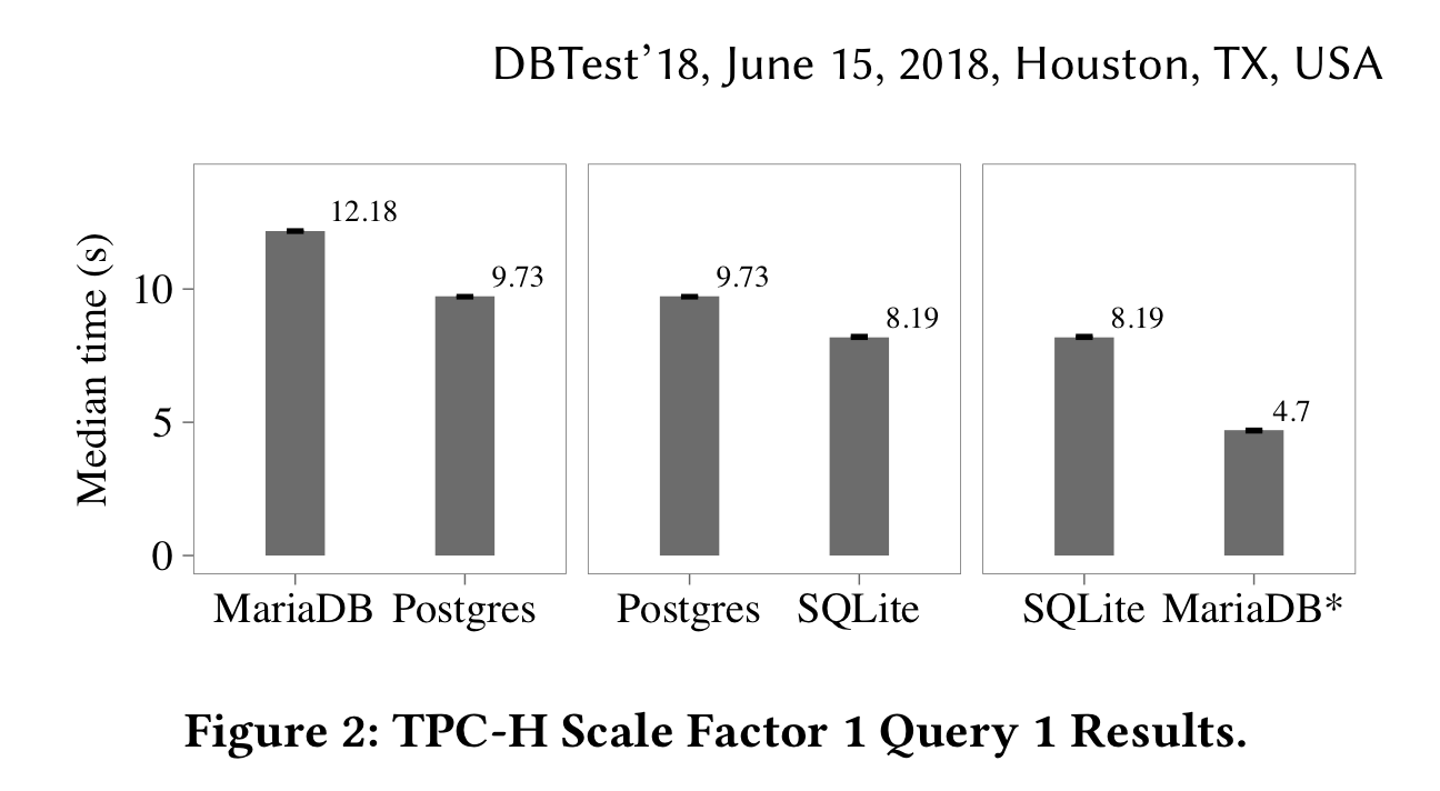 Апроизводительнее, чем база данныхВ, аВв свою очередь производительнееС, то сравниватьАиСникакого смысла нет. Хорошо, ведь так? Хорошо, если бы экспериментаторы не знали, что за данные и запросы будут использоваться в тесте. Иначе они могут перенастроить свою любимую базу данных строго на будущий тест. Взглянем на такой пример из работы [1].