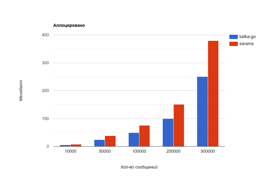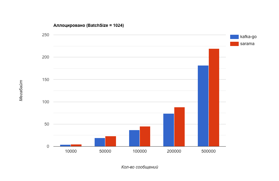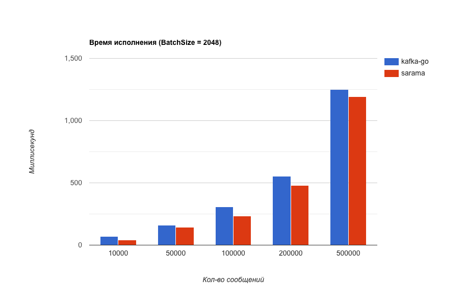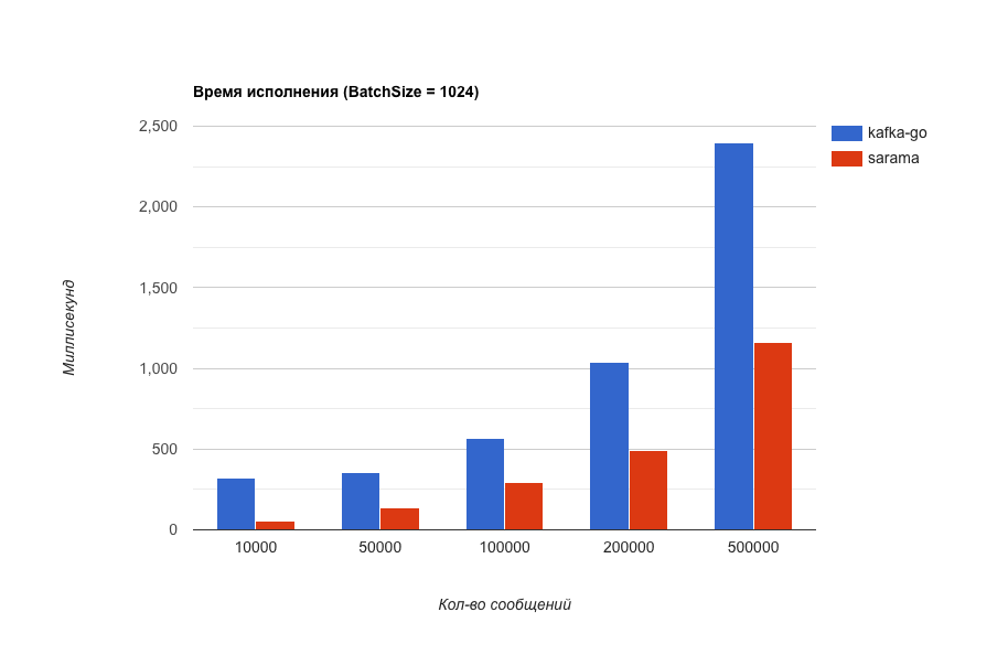 Что за BatchSize ? В kafka-go есть такая настройка, которая отвечает за размер блока сообщений, хранящийся в памяти перед отправкой в kafka. Эта настройка так сильно влияет на производительность, что я сделал еще один тест. (Для чистоты эксперимента в sarama имеется похожая настройка и ее значение изменялось в соответствии с тем, что выставлено в kafka-go).